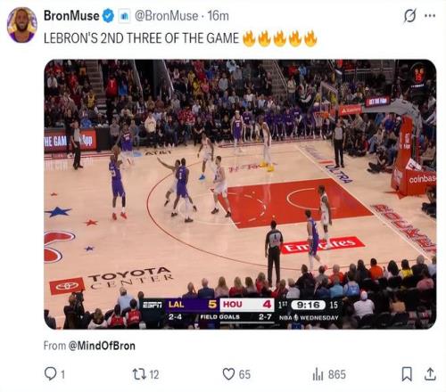 第二節(jié)勒布朗又完成了一個空中接力的暴扣,隨后接拉拉維亞傳球后快攻在罰球線的附近單臂劈扣,湖人拉開打13分打停火箭。湖媒:41歲的勒布朗僅打12分鐘已經(jīng)完成三次暴扣,看哭了GOAT。