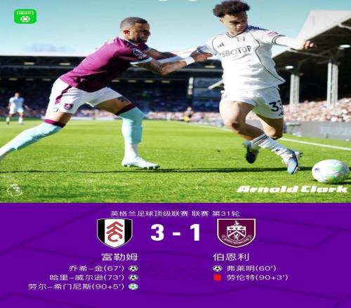 北京時間3月21日英格蘭足球超級聯(lián)賽第31輪,富勒姆主場對陣伯恩利。下半場弗萊明首開記錄,喬希-金破門扳平比分,哈里-威爾遜破門反超,勞爾-希門尼斯造點(diǎn)親自主罰命中,勞倫特被紅牌罰下。伯恩利弗萊明破門。最終比分富勒姆 3-1 伯恩利。