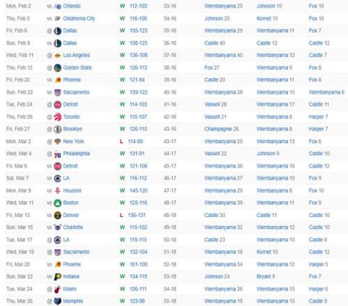 過去的25場比賽馬刺贏下了其中的23場,這23場勝利含金量非常高:魔術(shù)、雷霆、湖人、活塞(2次)、猛龍、綠凱、火箭、快船(2次)、太陽(2次)、熱火。馬刺距離聯(lián)盟第一的雷霆只剩下2個(gè)勝場而已。