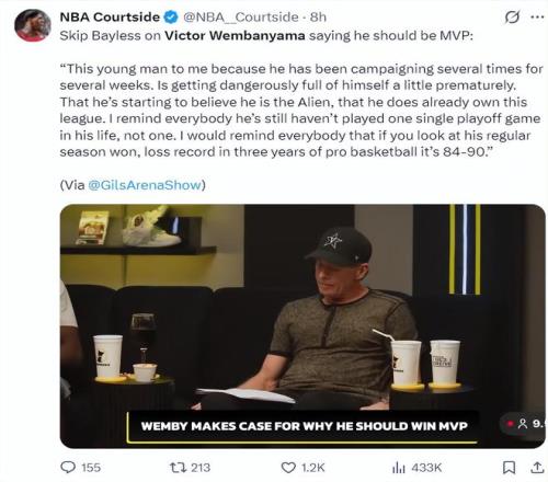 名嘴斯蒂芬-A-史密斯已經(jīng)開始力挺文班亞馬:他公開支持自己應(yīng)該拿到MVP,我們應(yīng)該明白文班亞馬不僅有希望拿到最佳防守球員、MVP、總冠軍,他根本不屑跟SGA、布朗等人去作比較,我認(rèn)為他就是MVP。