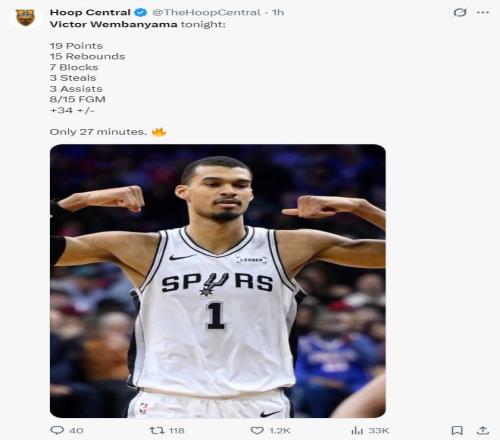 這場比賽文班亞馬短短27分鐘,15中8,三分3中1,罰球3中2,拿到19分15籃板3助攻3搶斷7蓋帽,命中率53.3%,正負(fù)值+34,他是真的太出色了,攻防兩端毫無軟肋可言。