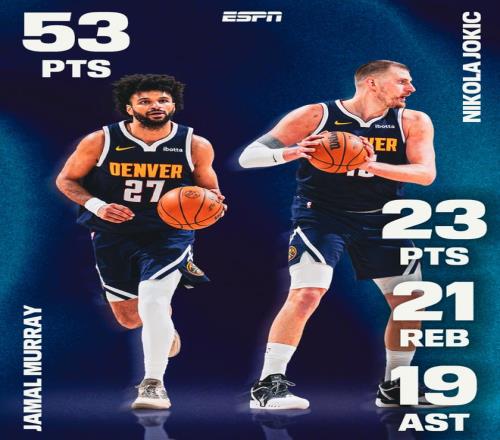 掘金的雙核一同爆炸,約基奇拿到23分21籃板19助攻的超級三雙,穆雷則拿到53分+9個三分球,掘金擊敗獨行俠拿到四連勝,掘金維持了西部第四的席位。