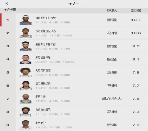 賈馬爾-穆雷+117聯(lián)盟第七;約基奇+115聯(lián)盟第八;里夫斯+106聯(lián)盟第九;杰倫-布朗和亞歷山大都是+105,并列聯(lián)盟第十。大家也許能猜到文班的正負(fù)值很高,但沒想到他是斷檔式領(lǐng)先,把第二名拉開了一大截,確實(shí)太夸張了!