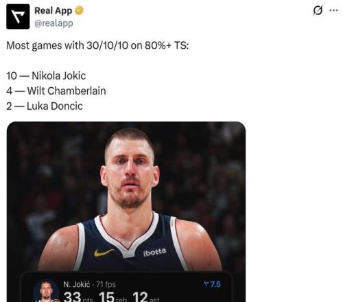 同時(shí)本場比賽也是約基奇生涯第10次以至少80%真實(shí)命中率砍下30+三雙,NBA歷史斷檔第一,張伯倫4次排在第二,東契奇2次排在第三。