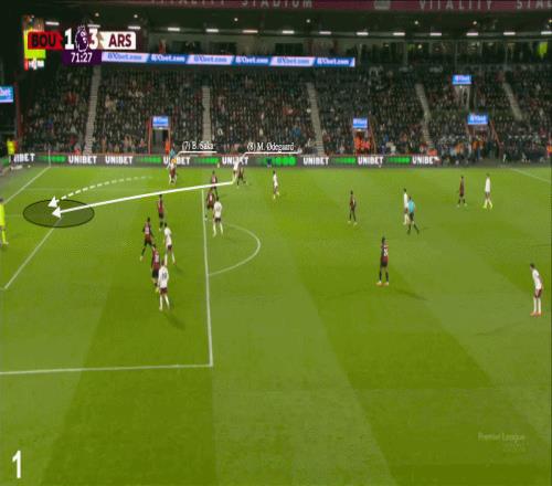 在他更為熟悉的右側(cè),他送出了一腳身后球,讓布卡約-薩卡去追。這腳傳球不僅洞穿了伯恩茅斯的后防線,還迫使對方門將與后衛(wèi)匆忙回防,導(dǎo)致球門——以及德克蘭-賴斯——暴露在空位之下,最終由賴斯完成破門。