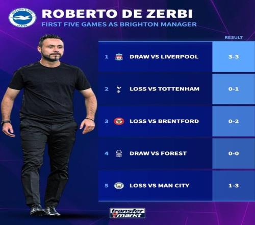 德澤爾比曾在2022年至2024年執(zhí)教英超球隊(duì)布萊頓,在這位意大利教練帶領(lǐng)的前5場比賽中,布萊頓一場未勝,戰(zhàn)績?yōu)?平3負(fù),分別戰(zhàn)平利物浦和諾丁漢森林,輸給了熱刺、布倫特福德和曼城。