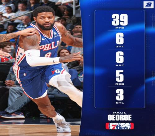 4.喬治成為費(fèi)城隊(duì)史首位39+5+5+5三分+3搶斷+0失誤的球員;