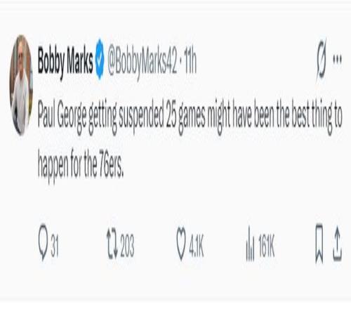 ESPN記者鮑比-馬克斯寫道:保羅-喬治被禁賽25場(chǎng),可能反而是76人發(fā)生的最好的一件事。