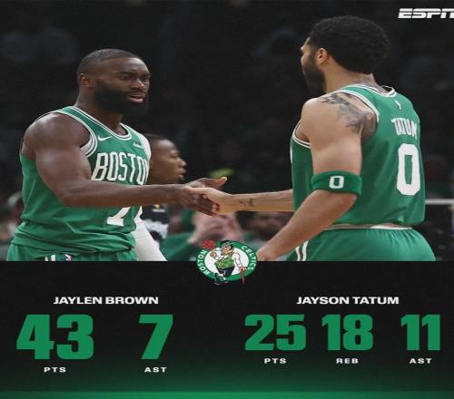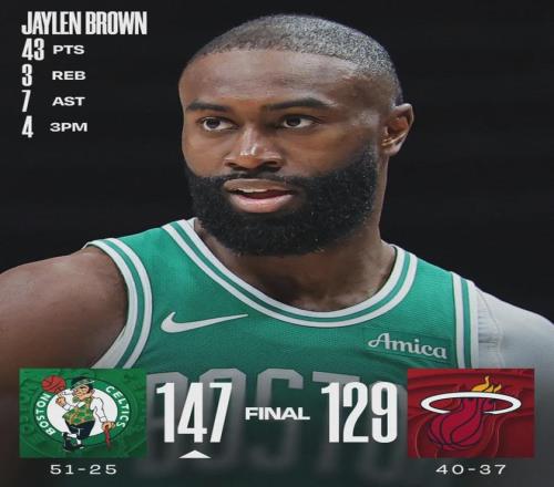 阿德巴約21投10中,三分10中5,罰球8中4,拿到29分10板2助2斷,正負(fù)值-23并列全場(chǎng)最低。綠軍雙探花爆發(fā):杰倫-布朗29投17中,三分10中4,罰球7中5,砍下43分4板7助。他本賽季7次砍下40+,此前9個(gè)賽季一共10次。