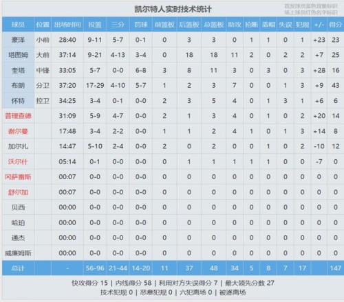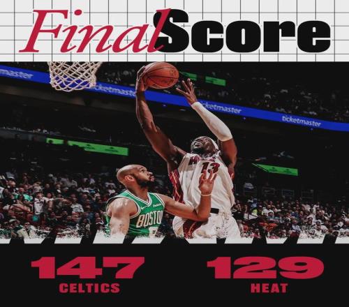 北京時(shí)間4月2日,凱爾特人客場(chǎng)147-129大勝熱火。四節(jié)比分(凱爾特人在前):53-33、27-24、32-45、35-27。目前凱爾特人51勝25負(fù)落后活塞4個(gè)勝場(chǎng),仍居?xùn)|部第二;熱火40勝37負(fù)跌至東部第十,落后魔術(shù)0.5個(gè)勝場(chǎng)。