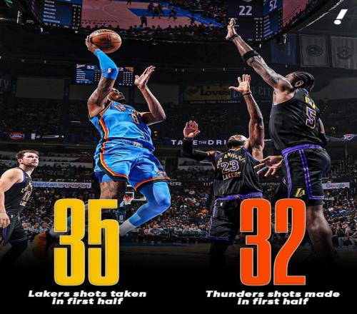 第十二,雷霆上半場(chǎng)甩進(jìn)32球,限制湖人只出手35次。