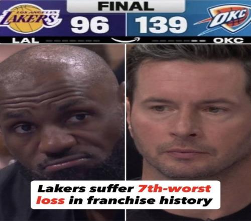 首先,湖人慘敗雷霆43分,也創(chuàng)造了隊(duì)史第七大失利分差。