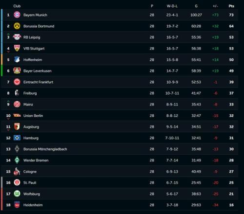 北京時(shí)間4月6日凌晨,德甲第28輪九場(chǎng)比賽全部結(jié)束。憑借比朔夫、卡爾補(bǔ)時(shí)連進(jìn)2球,拜仁讓二追三擊敗弗賴堡,同時(shí)本賽季聯(lián)賽進(jìn)球也達(dá)到百球大關(guān);多特蒙德客場(chǎng)2比0笑傲與斯圖加特的強(qiáng)強(qiáng)對(duì)話,與拜仁的分差依然維持在9分,而輸球的斯圖加特則是被本輪2比1擊退云達(dá)不萊梅的萊比錫反超排名;聯(lián)賽第五的霍芬海姆主場(chǎng)1比2負(fù)于美因茨,身后的勒沃庫(kù)森趁勢(shì)以一場(chǎng)6比3狼堡的大勝將分差縮小至1分。