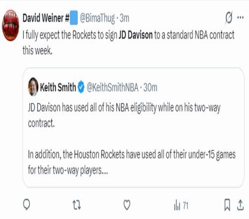 隨后火箭記者大衛(wèi)-韋納轉(zhuǎn)推寫道:我堅(jiān)信本周火箭隊(duì)就會(huì)將戴維森的雙向合同轉(zhuǎn)為標(biāo)準(zhǔn)合同。