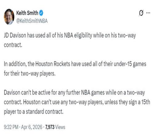 北京時(shí)間4月6日晚,根據(jù)NBA記者肯尼-史密斯的報(bào)道,JD-戴維森已經(jīng)執(zhí)行完了他雙向合同50場NBA常規(guī)賽的額度,火箭在激活的50場中只讓他打了27場,換言之戴維森已經(jīng)無法為火箭出戰(zhàn)任何的比賽,除非他們重新簽下一名標(biāo)準(zhǔn)合同球員。