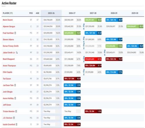 那么將戴維森轉(zhuǎn)正后,火箭就會(huì)帶著15份全額保障合同進(jìn)入季后賽:戴維森、杜蘭特、申京、范弗利特、亞當(dāng)斯、芬尼史密斯、小賈、謝潑德、阿門、卡佩拉、伊森、泰特、奧科吉、霍勒迪、杰夫-格林。