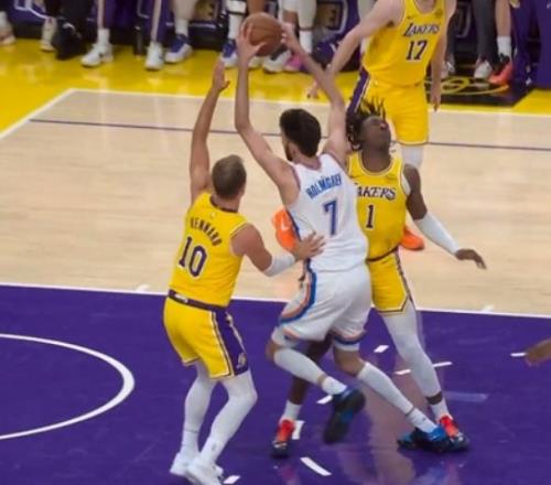 除此之外,蒂耶羅防守霍姆格倫被吹罰防守犯規(guī),但他被對手肘擊打中臉部受傷返回更衣室。湖人申請?zhí)魬?zhàn)成功,改判為霍姆格倫進攻犯規(guī)。
