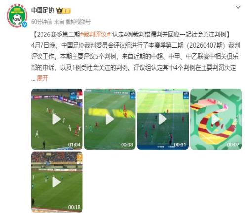 4月8日下午,中國足協(xié)公布了2026賽季第二期裁判評議結(jié)果,認(rèn)定4例裁判錯(cuò)漏判,并回應(yīng)一起社會(huì)關(guān)注判例。其中,與中超賽場有關(guān)的3個(gè)判例中,2個(gè)出現(xiàn)錯(cuò)漏判。