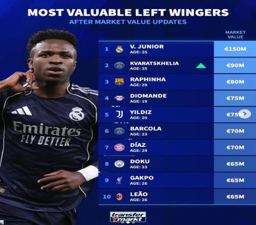 德轉(zhuǎn)左邊鋒身價(jià)前10:維尼修斯1.5億第一、KK、拉菲尼亞二三位