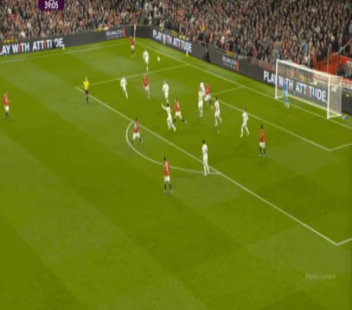 就在后續(xù)的進攻里,利茲聯(lián)打開寬度,由翼衛(wèi)從左邊送上傳中,這個時候的曼聯(lián)就已經(jīng)需要拉門斯救命了: