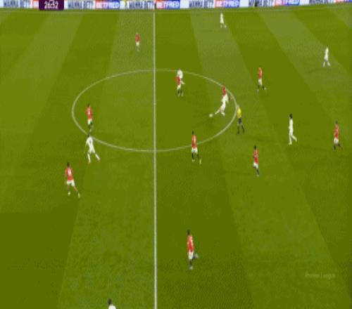 所以在這場比賽,曼聯(lián)擺出的這套陣容就決定了,中后場天然存在面對壓力的退縮傾向,很容易越打越害怕,越害怕越縮,就像22分鐘連續(xù)被輸出身體的利茲聯(lián)直接搶斷,從而連續(xù)應(yīng)對防守壓力這樣:
