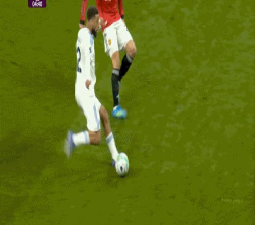 第45分鐘,曼聯(lián)后場出球再出問題,拉門斯和約羅連接失誤,就是這一球,又一個該發(fā)力解圍的球,約羅選擇用右腳勉強處理,結(jié)果解圍不遠(yuǎn),剛好落在中間,利茲聯(lián)又從卡塞米羅身后搶出來,差點就打出了第三球: