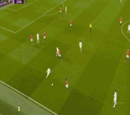 這一點還沒完,第29分鐘,利茲聯(lián)先是在前場用身體搶斷布魯諾,獲得了可以繼續(xù)比賽的許可,大范圍轉(zhuǎn)移到右路之后,直接用45度長傳打到了門前: