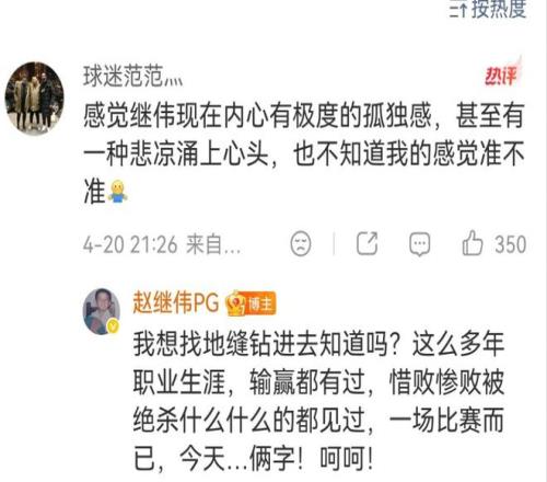 在大比分輸?shù)舯荣愔?,趙繼偉在自己的社交媒體上面發(fā)了“呵呵”兩個(gè)字,并且在評(píng)論區(qū)回復(fù)道“這么多年大勝慘敗絕殺都見(jiàn)過(guò)了,但是對(duì)于今天這場(chǎng)球,只有呵呵兩個(gè)字”,并且在現(xiàn)場(chǎng)可以看到趙繼偉顯得非常的落寞,球隊(duì)目前的凝聚力真的太差了,目前這樣的情況下去,遼寧男籃季后賽估計(jì)真的一輪游的情況了!
