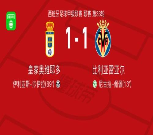 北京時(shí)間4月24日西班牙足球甲級(jí)聯(lián)賽 聯(lián)賽 第33輪,皇家?jiàn)W維耶多主場(chǎng)對(duì)陣比利亞雷亞爾?;始?jiàn)W維耶多伊利亞斯-沙伊拉破門(mén)。比利亞雷亞爾尼古拉-佩佩破門(mén)。最終比分皇家?jiàn)W維耶多 1-1 比利亞雷亞爾。