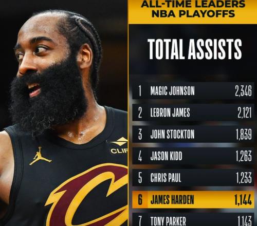 憑借這一次助攻,哈登迎來里程碑,獨(dú)享NBA季后賽歷史助攻榜的第六位。
